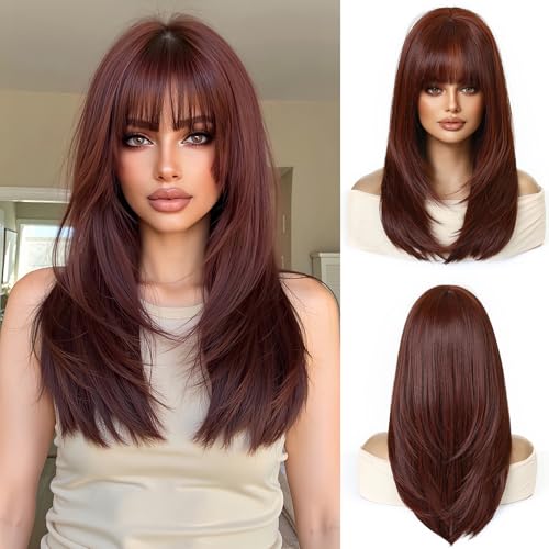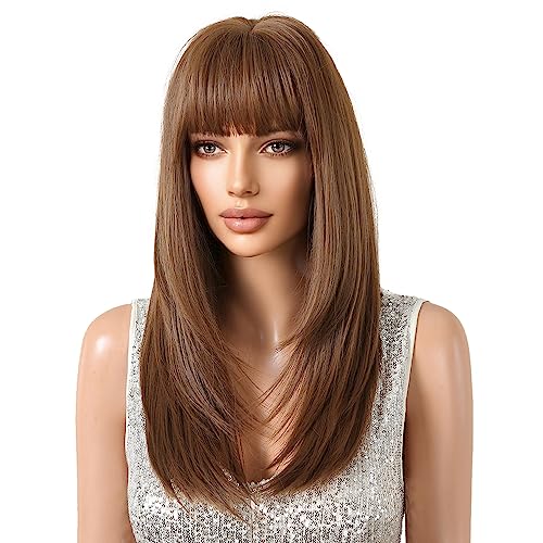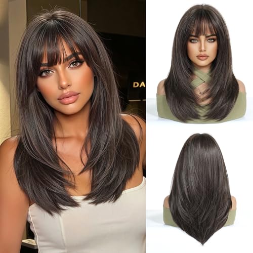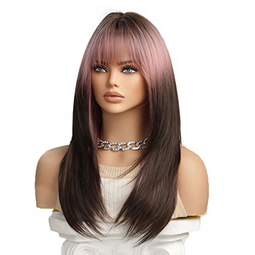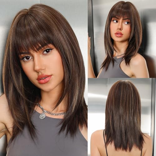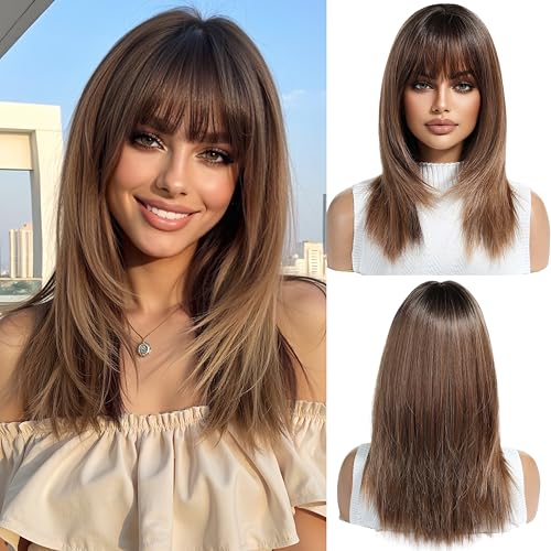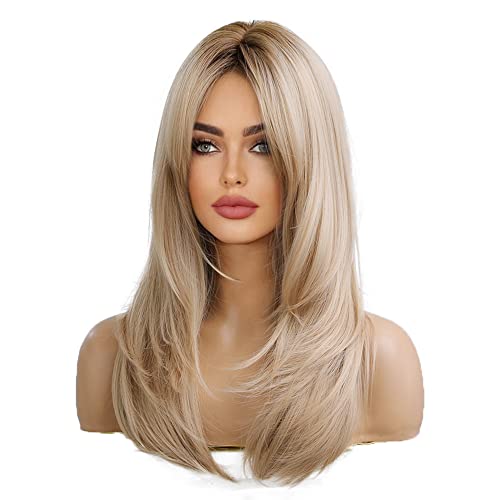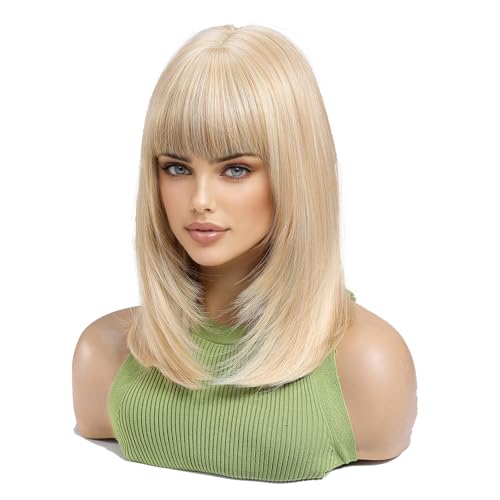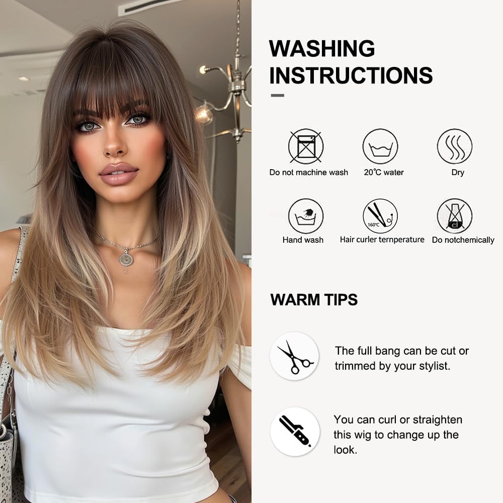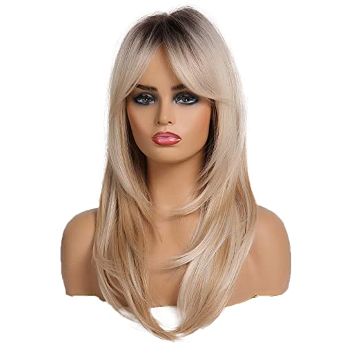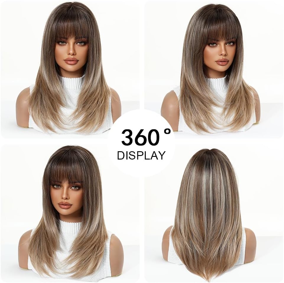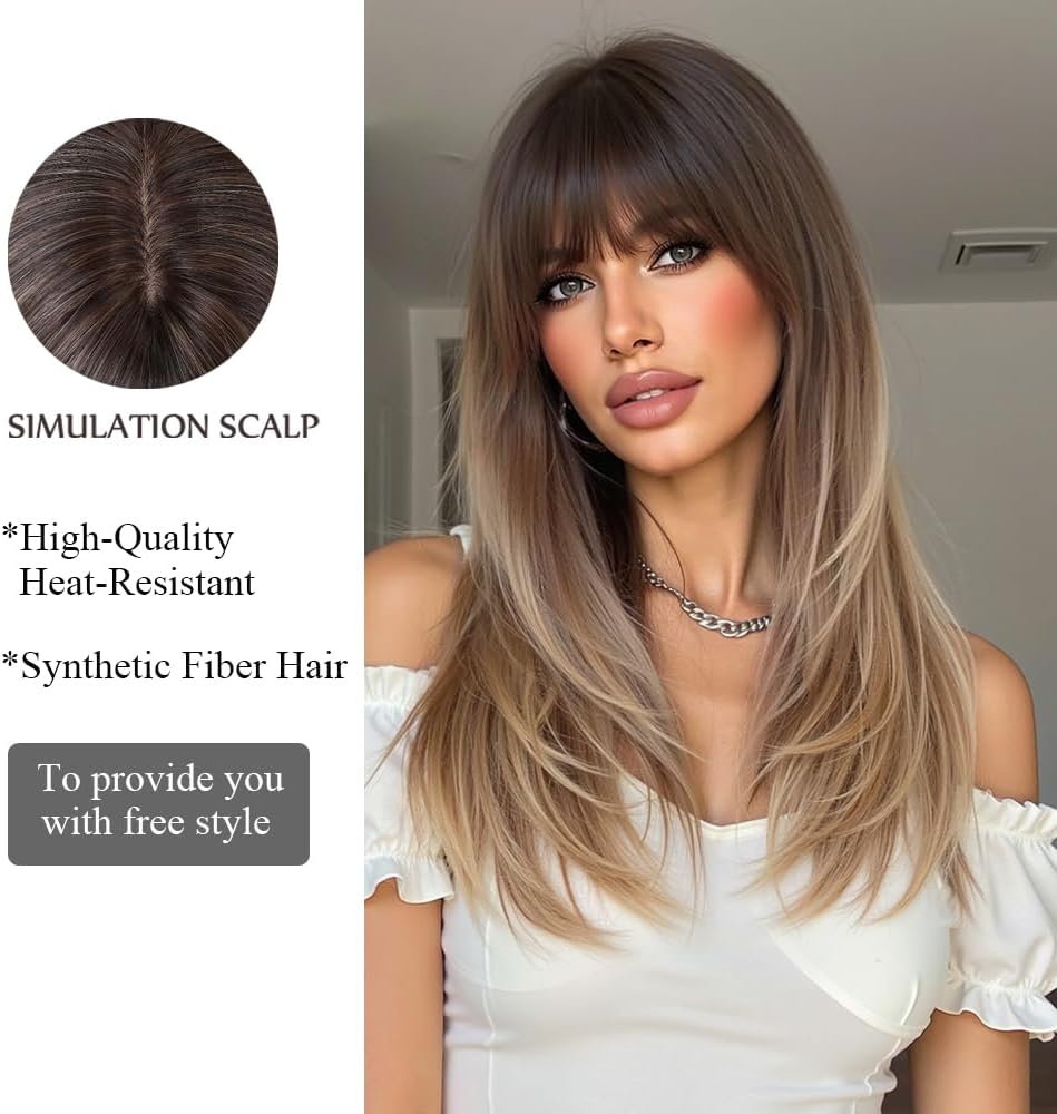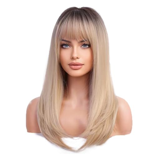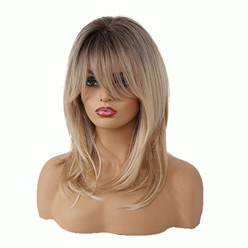 This stunning synthetic wig mixes soft blonde hues with darker roots for a sunlit, natural vibe. Made from heat-resistant Kanekalon fibers, you can style it up to 350°F without worry. The breathable rose-net cap keeps your head cool, while adjustable straps ensure a comfy fit for most sizes. With silky, tangle-free strands and a flattering medium length featuring gentle bangs, it’s perfect for everyday fun or special occasions. Lightweight and easy to care for, this ombre beauty adds playful depth with a touch of shine—style those bangs however you like!