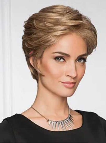 Offering generous length in the front and crown, and all over tapered layers that blend to an extended nape, this classic short cut wig includes an Upscale hand-knotted monofilament part for varied parting options and a sheer lace front for natural, off-the-face styling.