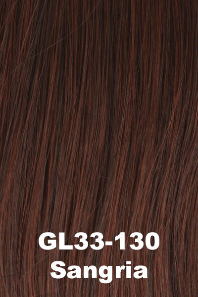 Wig Colors: Double Espresso (GL1-2), Black Coffee (GL2-6), Dark Chocolate (GL4-8), Mahogany (GL6-30), Dark Chestnut (GL8-10), Hazelnut (GL8-29), Sunlit Chestnut (GL10-12), Walnut (GL10-14), Honey Pecan (GL11-25), Mocha (GL12-14), Golden Walnut (GL12-16), Honey Toast (GL14-16), Sandy Blonde (GL14-22), Buttered Toast (GL15-26), Buttered Biscuit (GL16-27), Toasted Pecan (GL18-23), Sunkissed Beige (GL23-101), Caramel (GL27-22), Chocolate Caramel (GL27-29), Rusty Auburn (GL29-31), Dark Copper (GL30-32), Sangria (GL33-130), Sugared Smoke (GL38-48), Sugared Charcoal (GL44-51), Sugared Pewter (GL51-56), Sugared Silver (GL56-60), Silvery Moon (GL60-101)